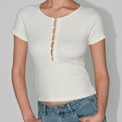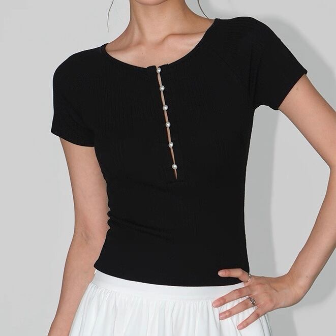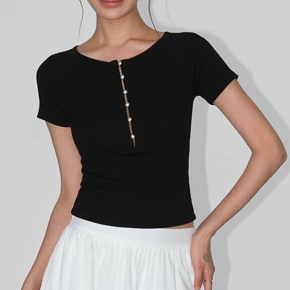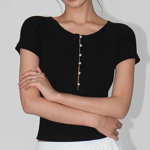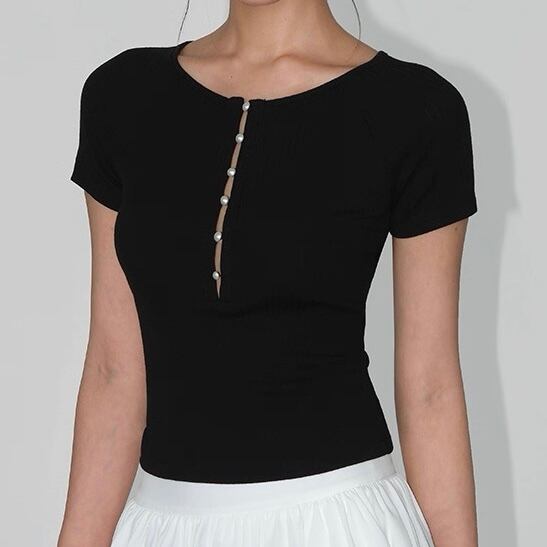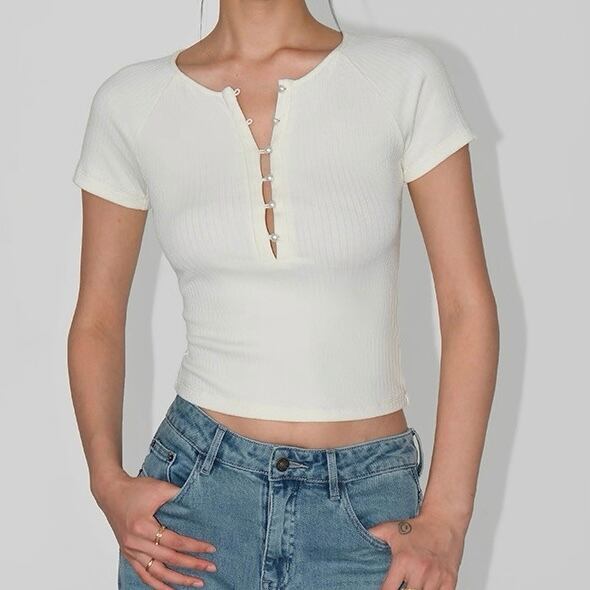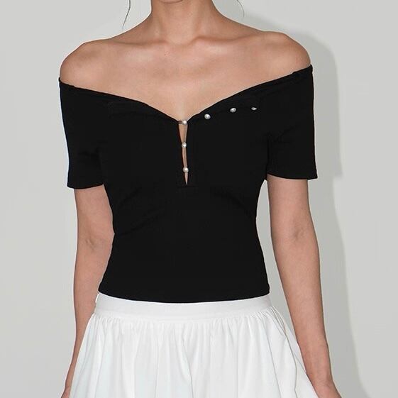 ボートネックのシンプルなデザインながらフロントのボタンが