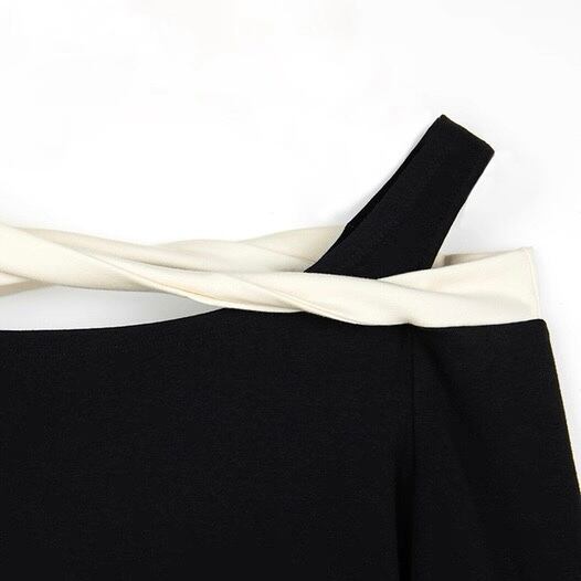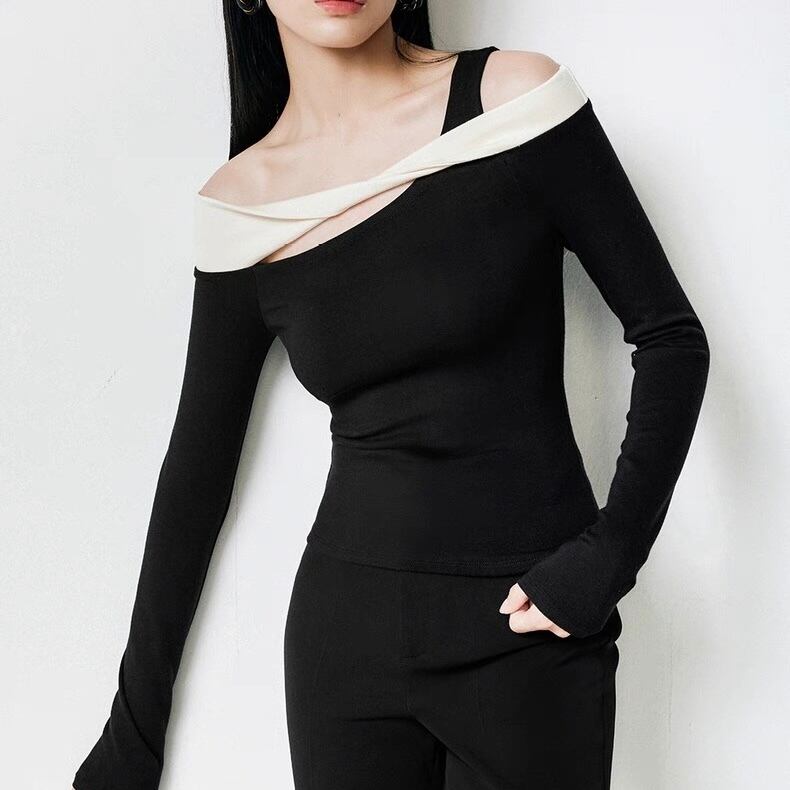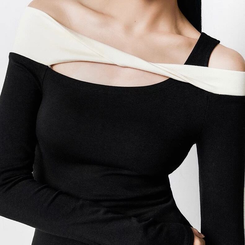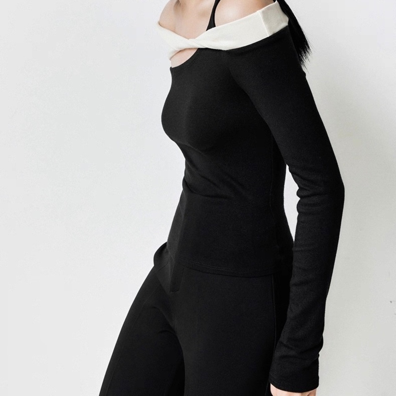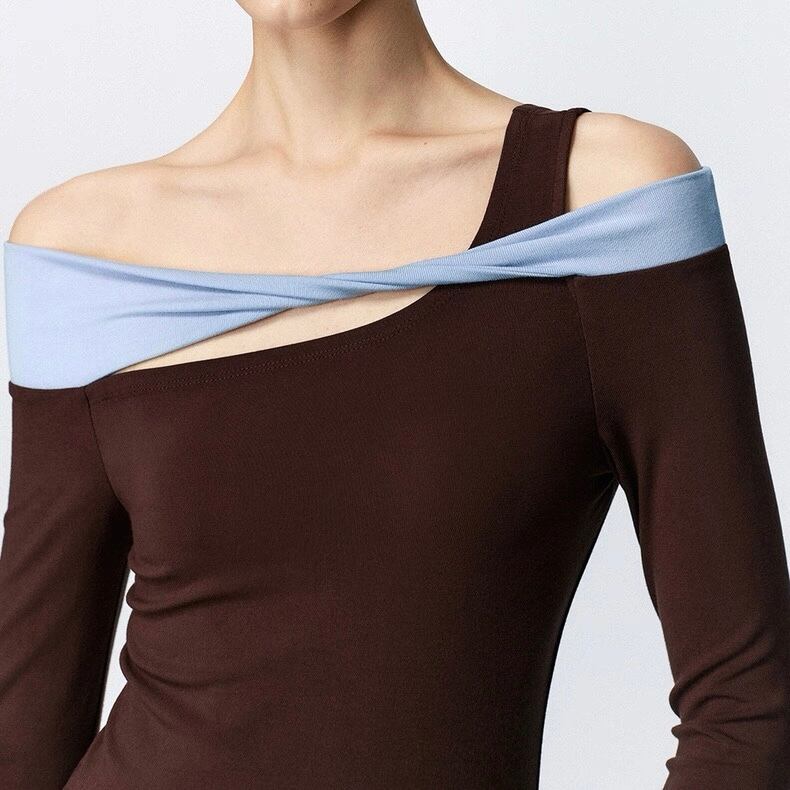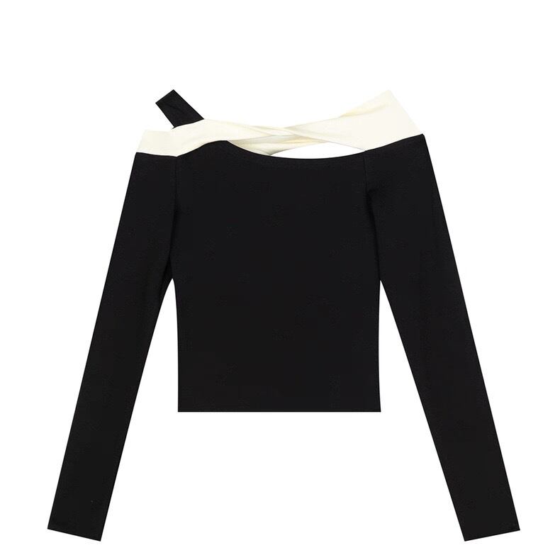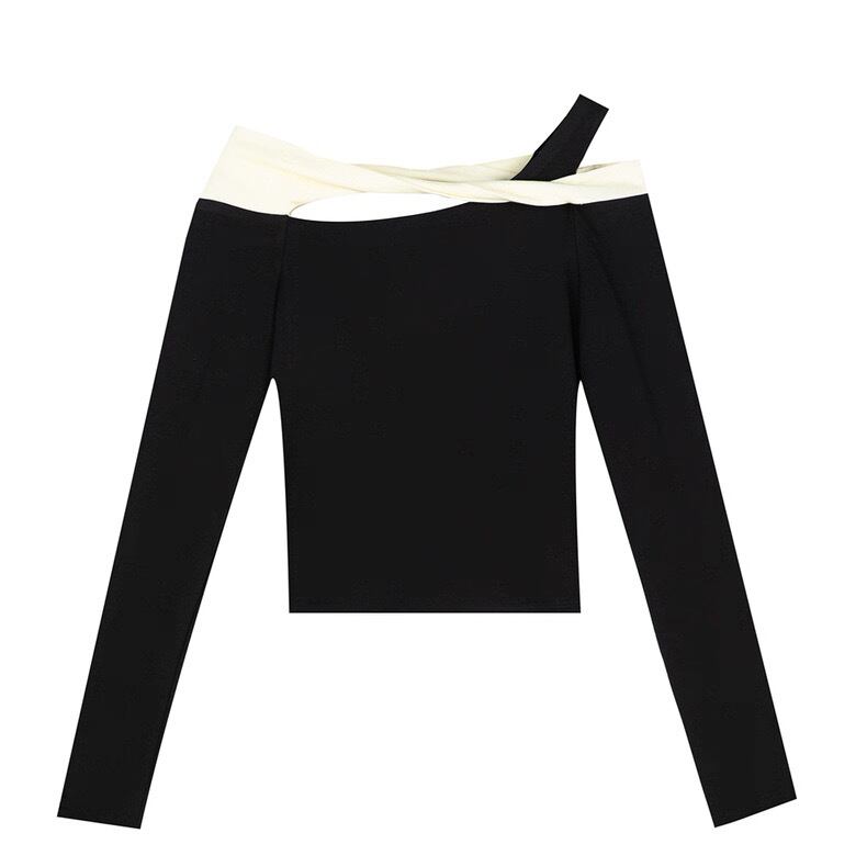 アシンメトリーなオフショルダーデザインが目を惹くトップス。