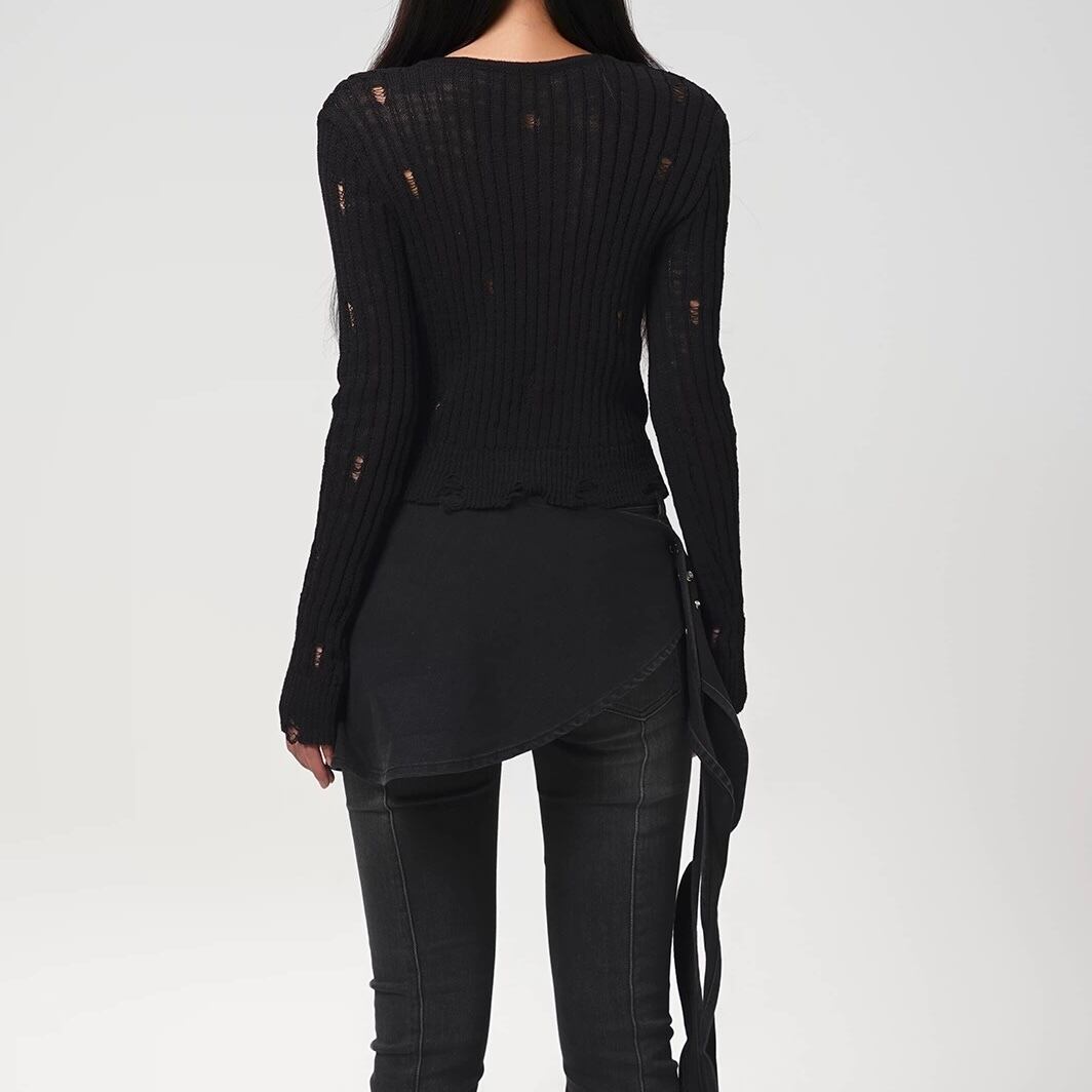 ダメージ加工が施されたニットカーディガン。Vネックのフロントジップアップデザインが、こなれ感を演出します。