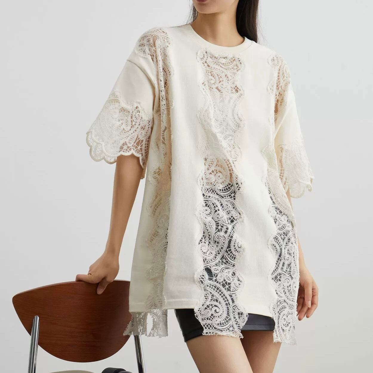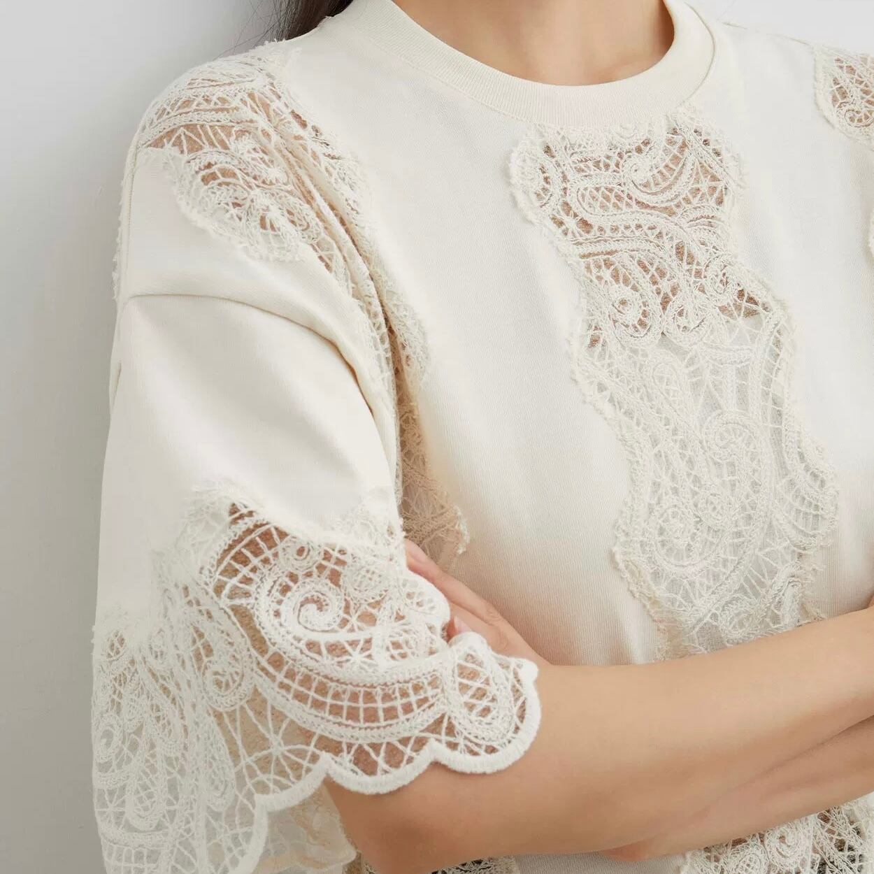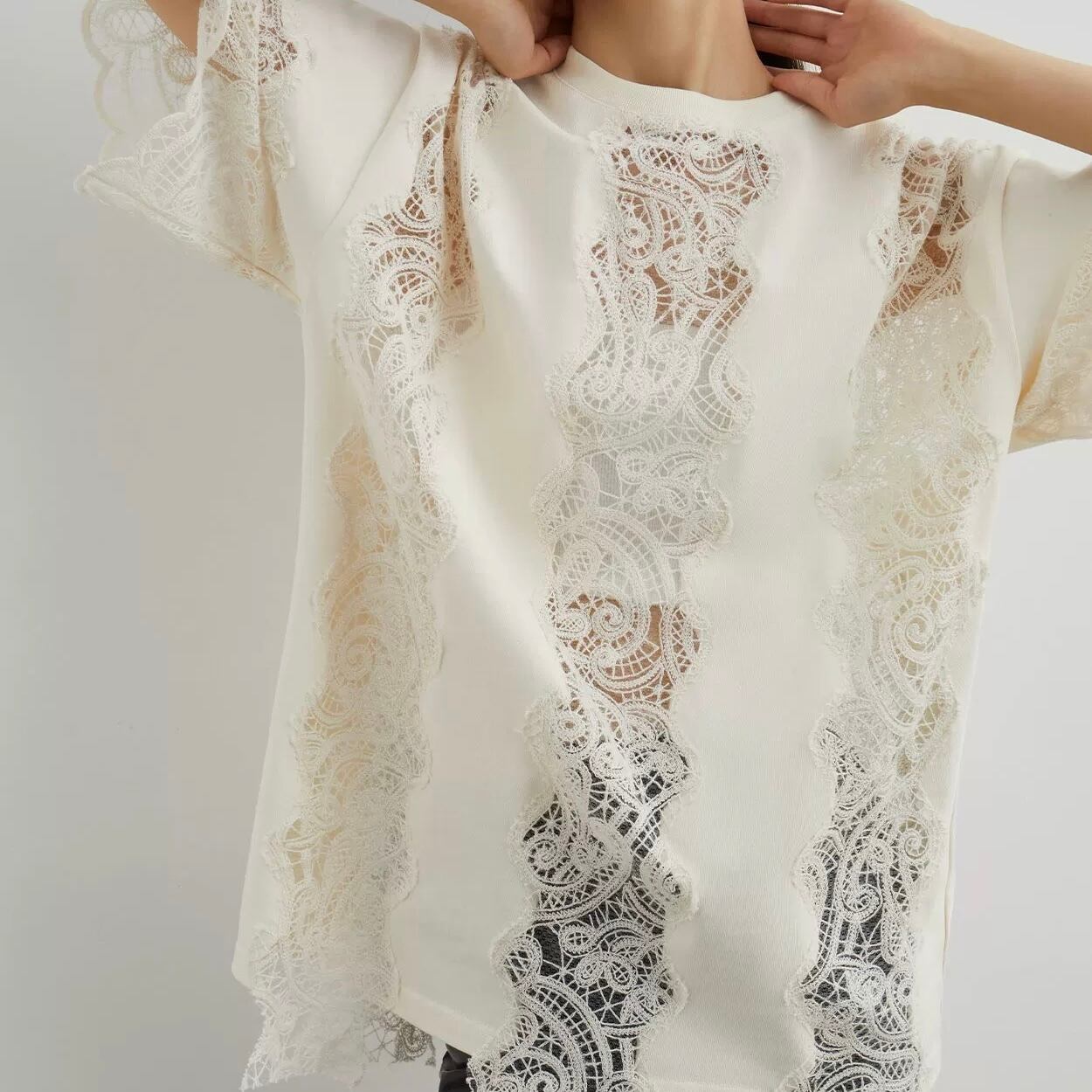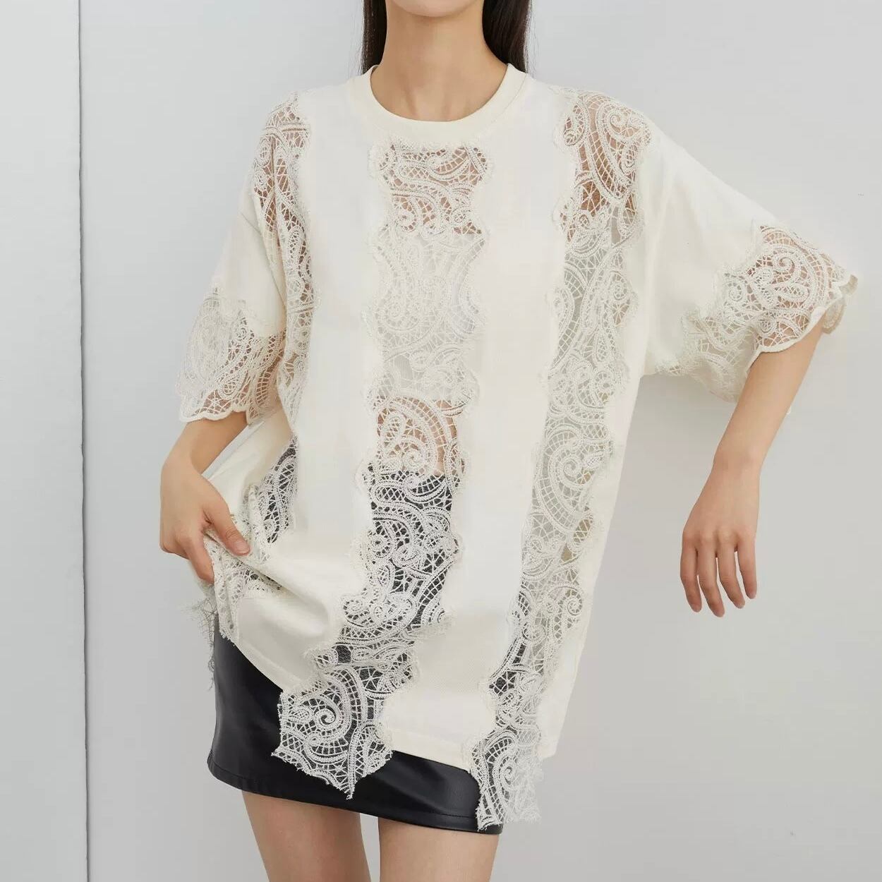 体型カバーしつつ透け感のあるレースが上品な抜け感をプラス。