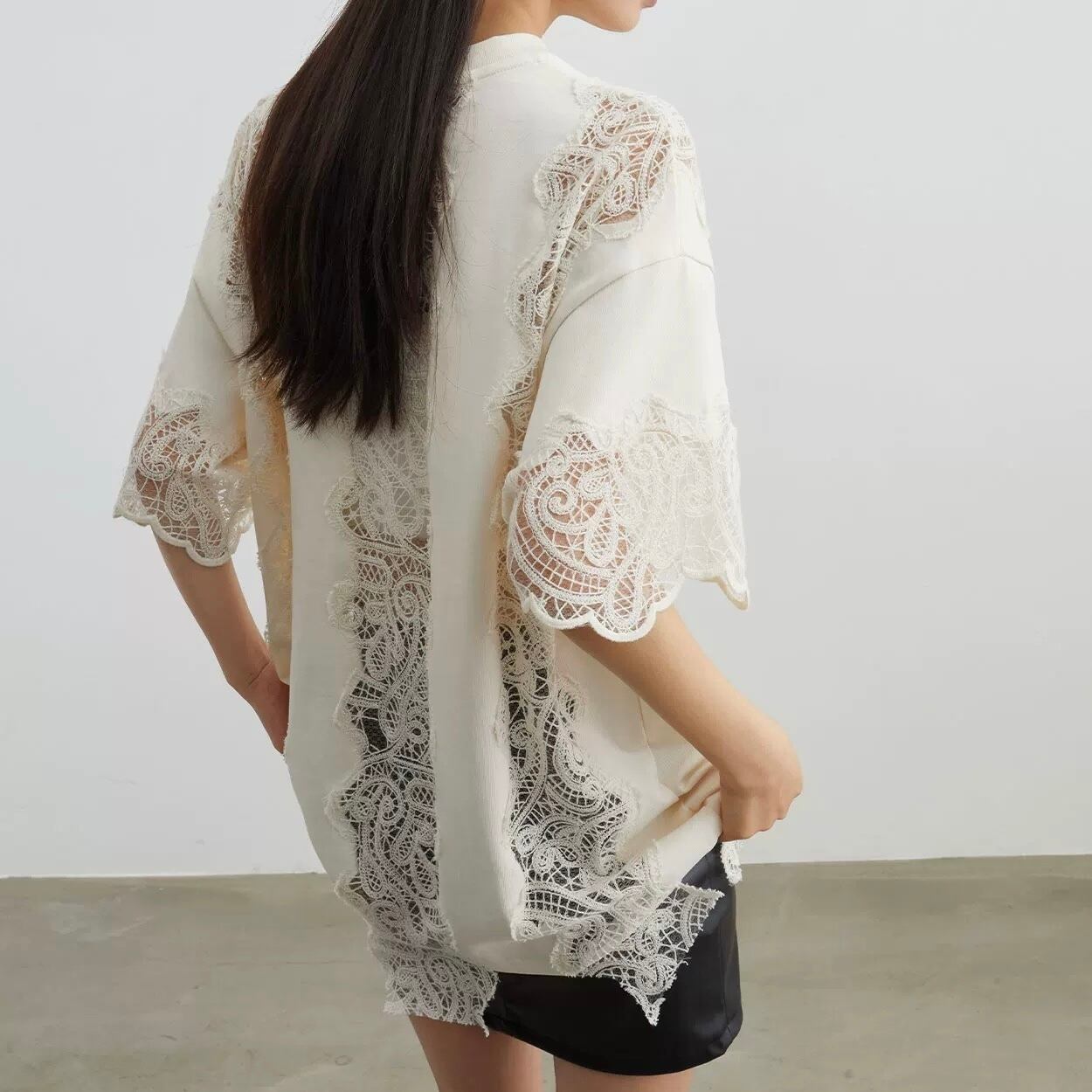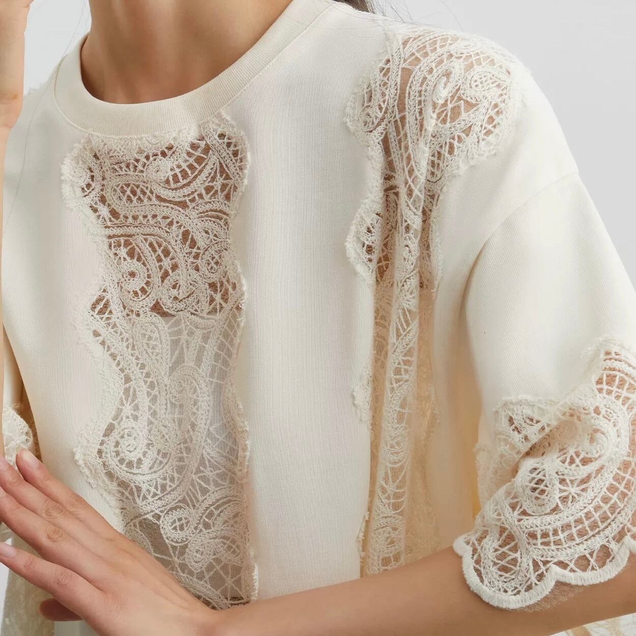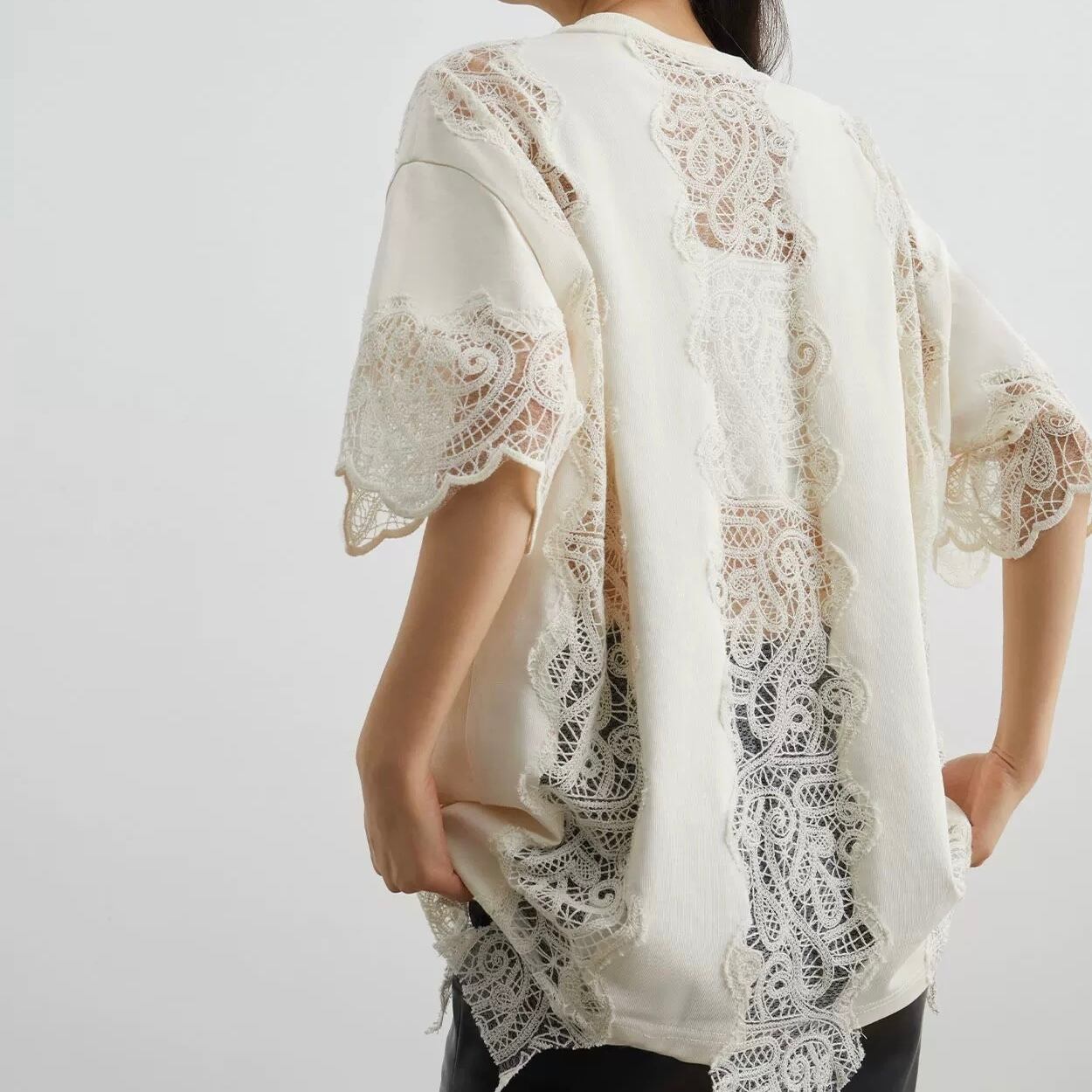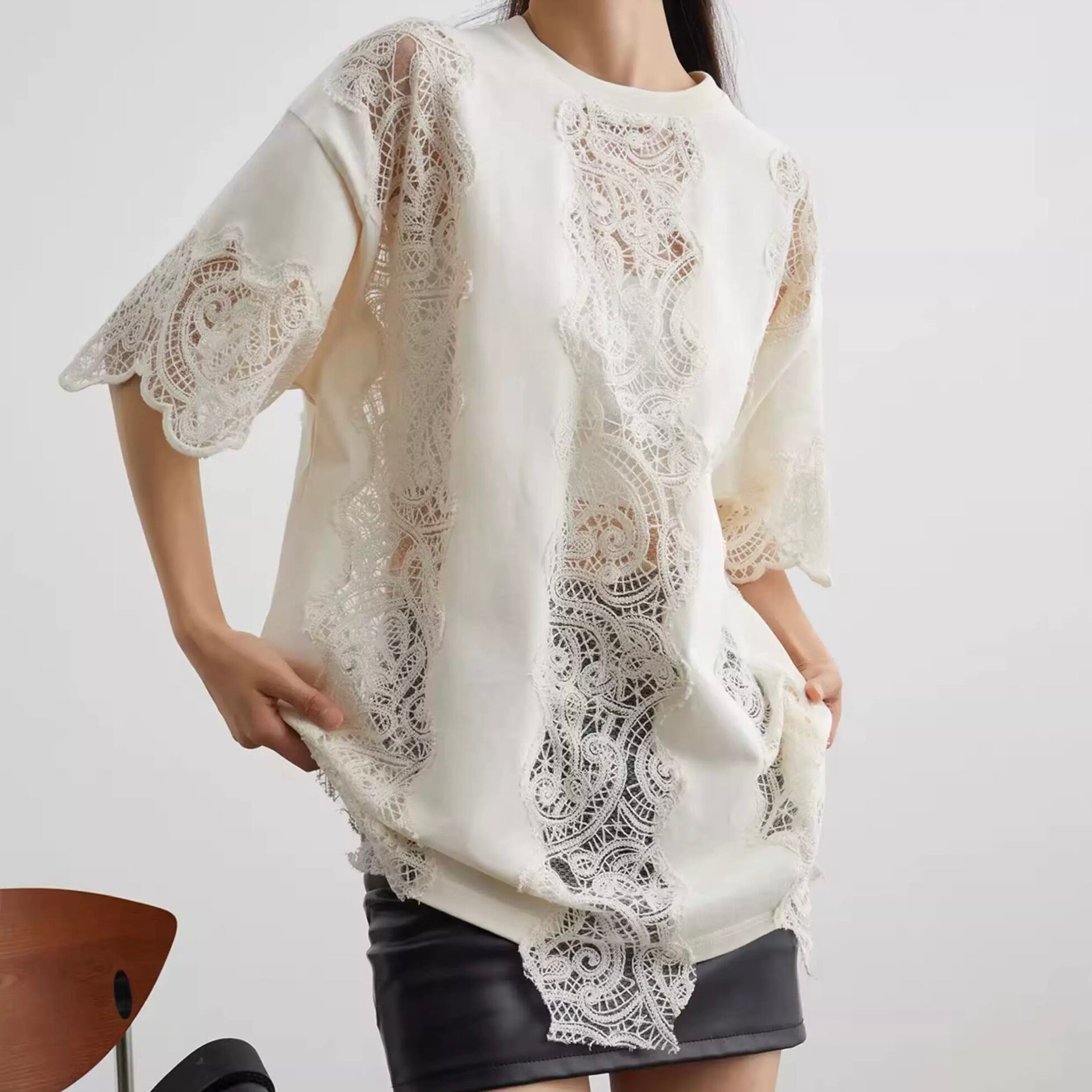 体型カバーしつつ透け感のあるレースが上品な抜け感をプラス。