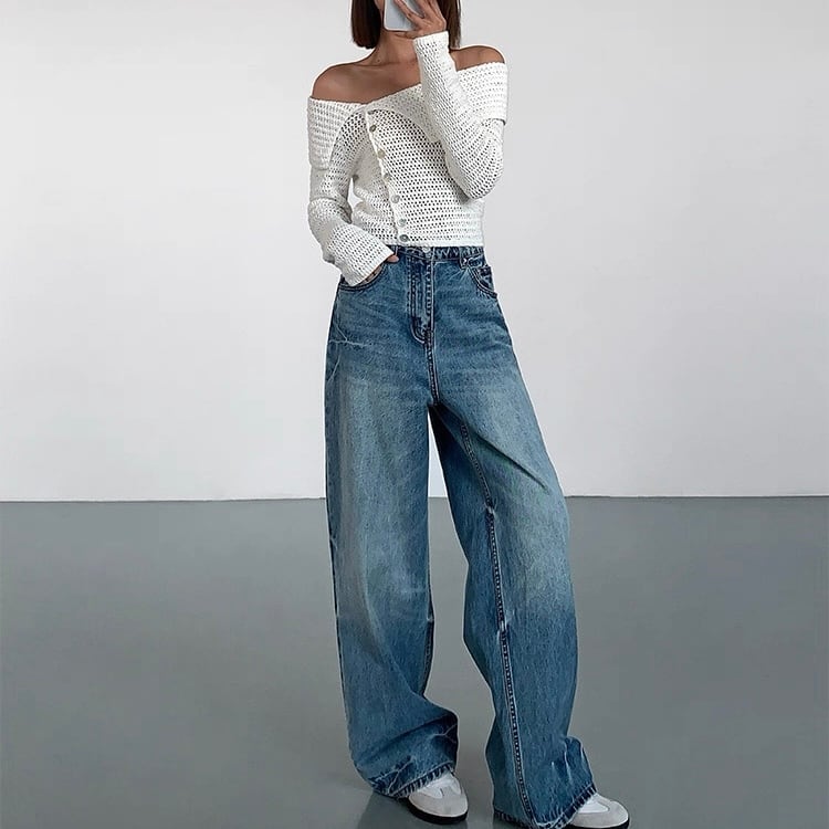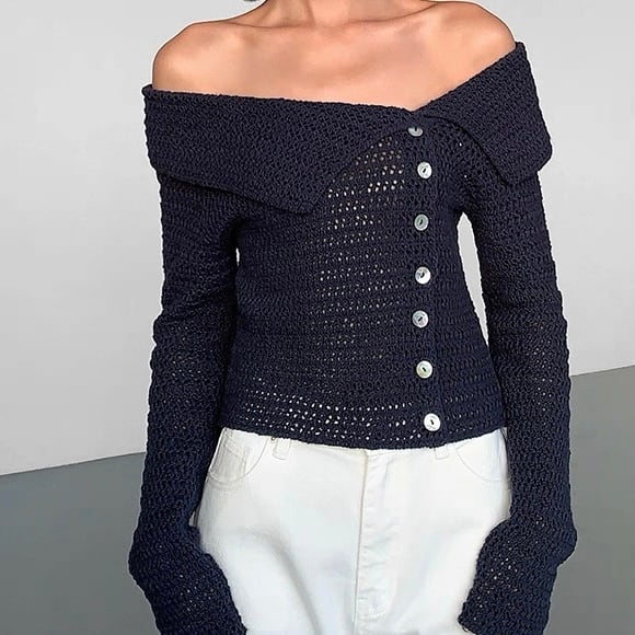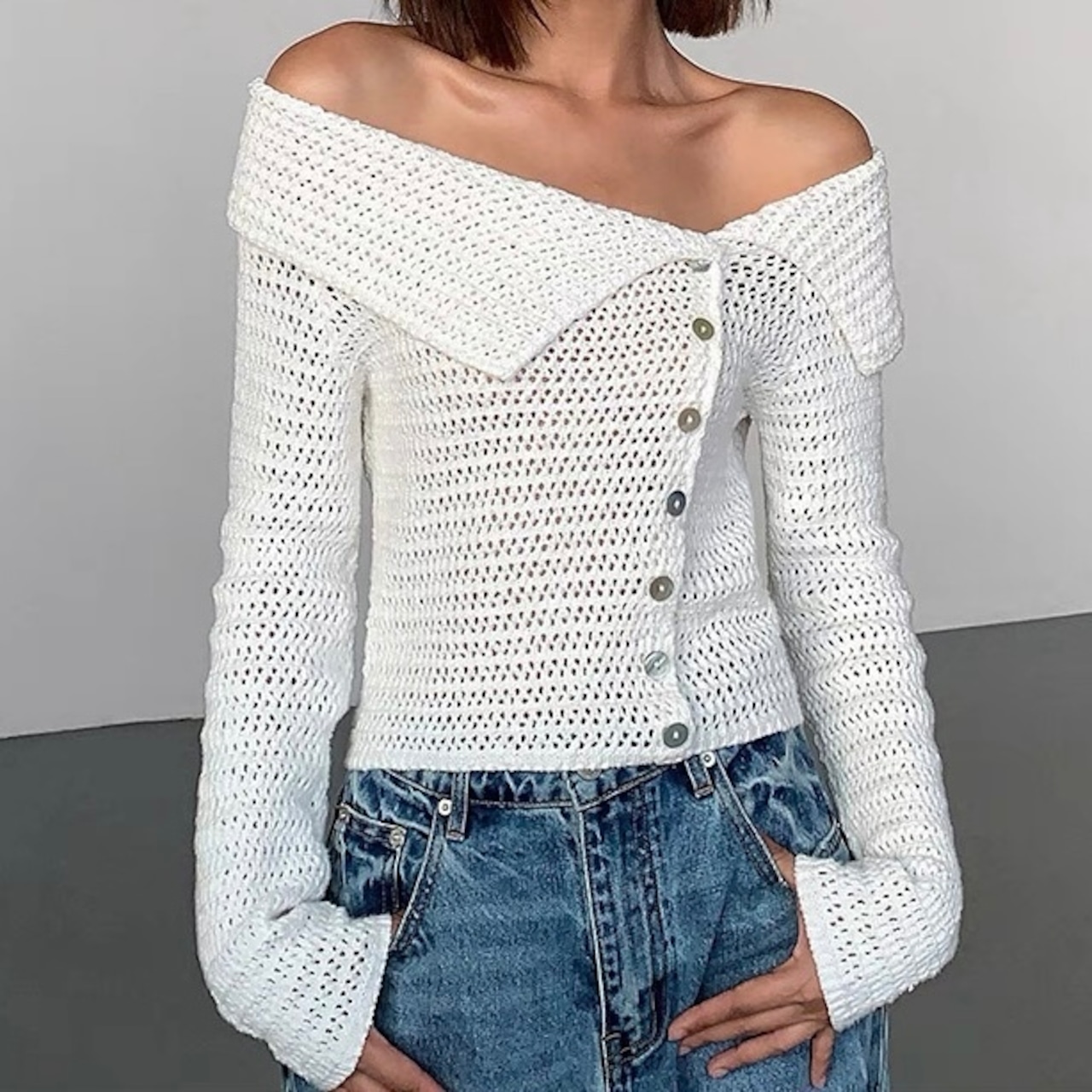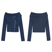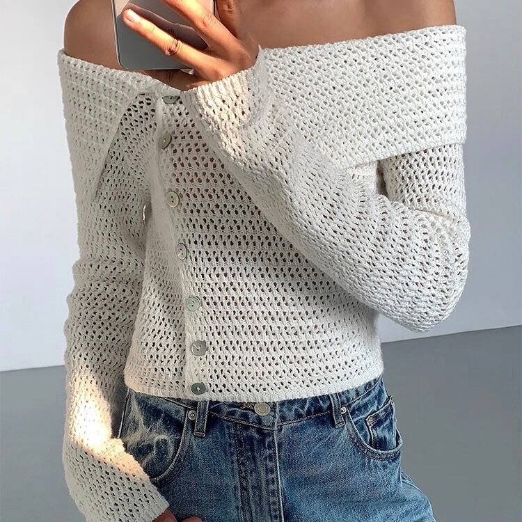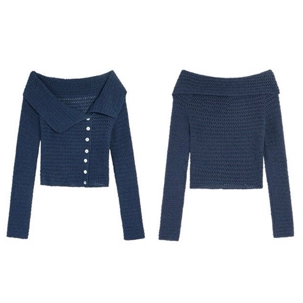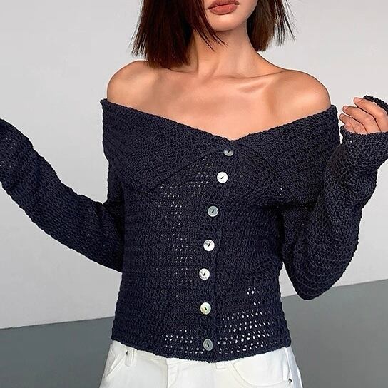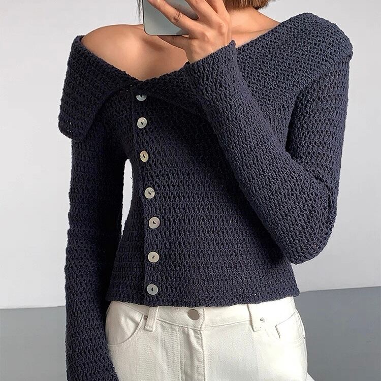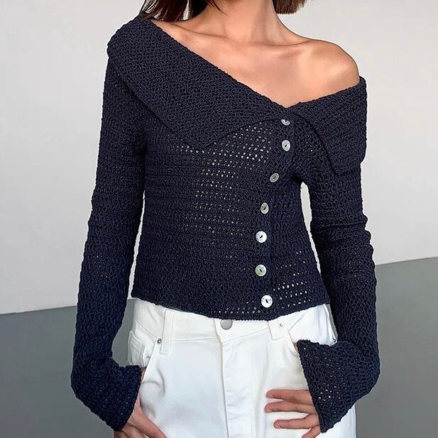 ざっくりとした編み地とフロントボタンが、抜け感とモード感を両立させます。
