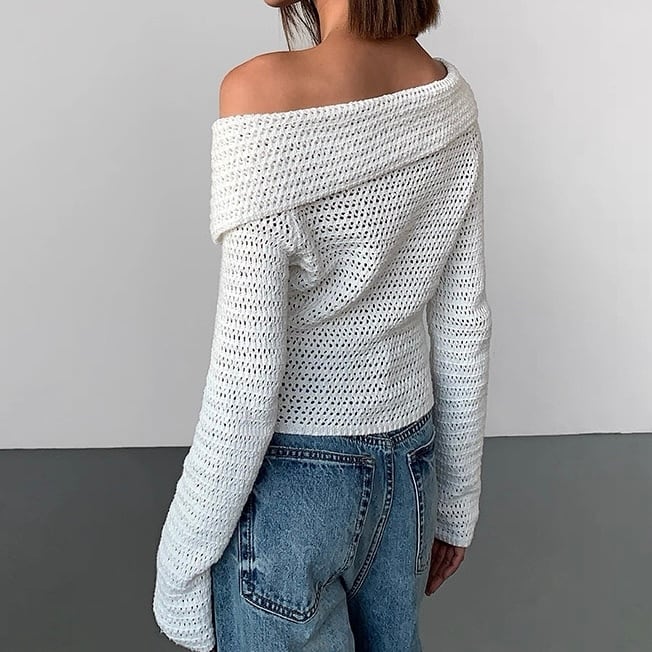 肩をゆるく覗かせるワイドカラーが女性らしさを引き立てるトップス。