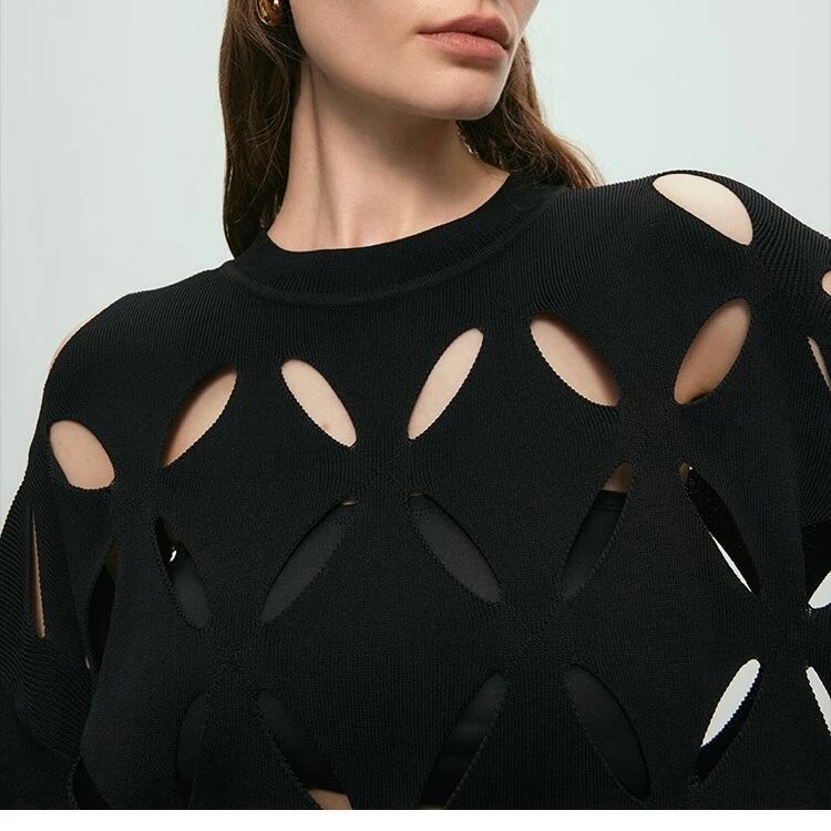 大胆な幾何学模様の切り抜きが、シンプルなコーディネートにアクセントをプラス。