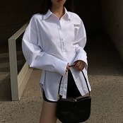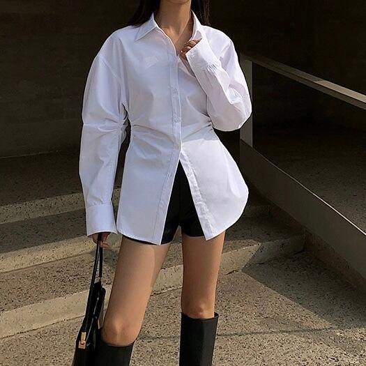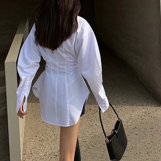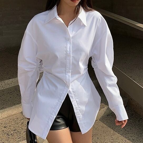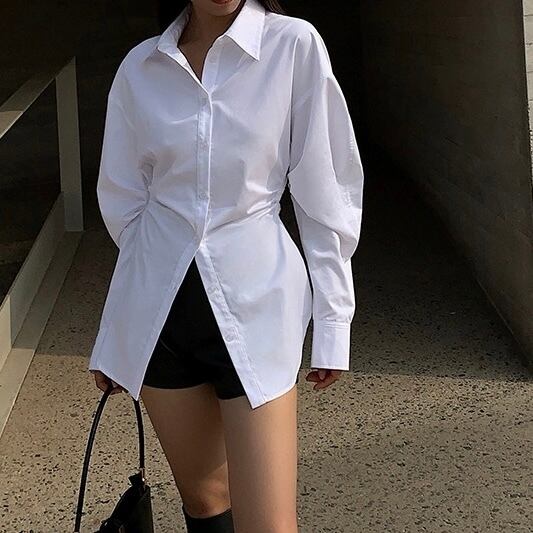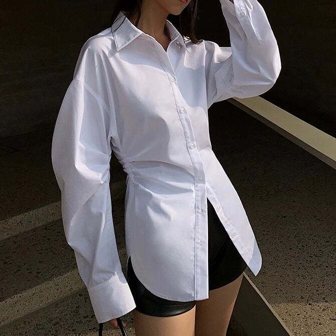 ウエストシェイプされたシルエットが美しいオーバーサイズシャツ。バルーンスリーブが女性らしい