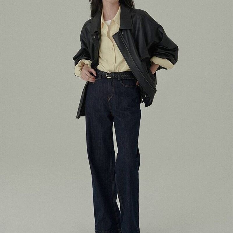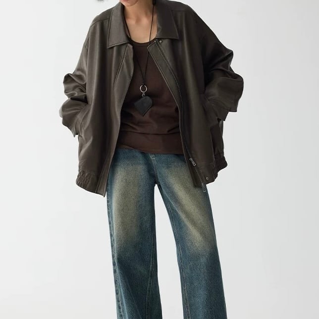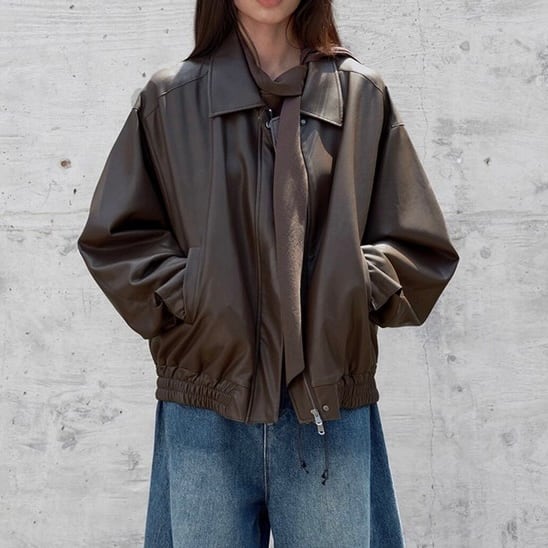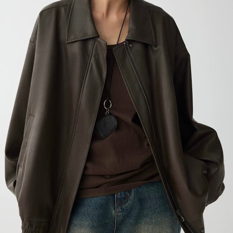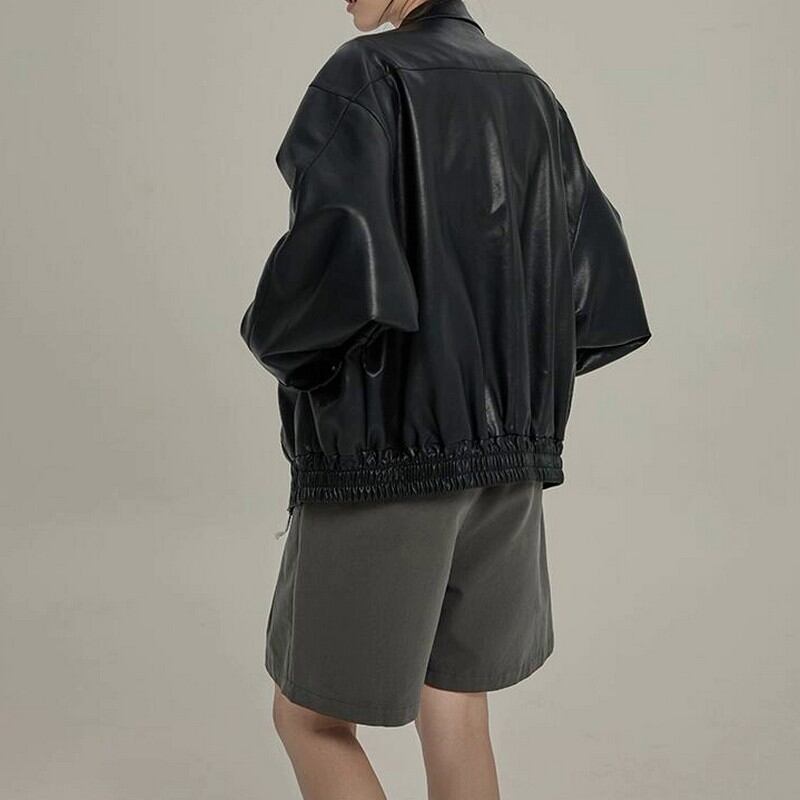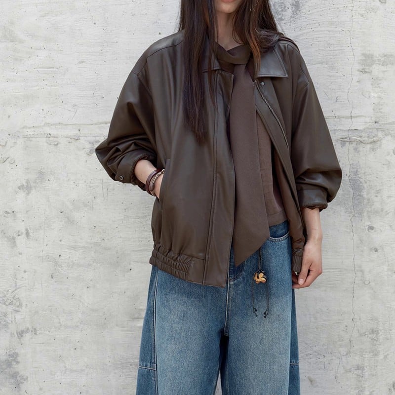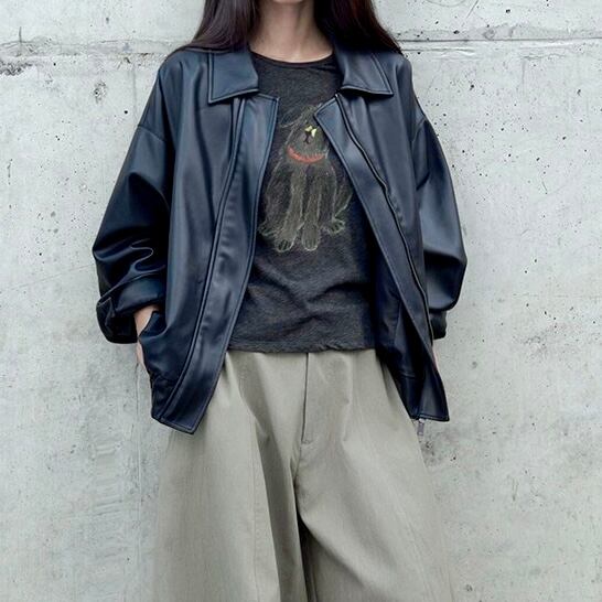 ドロップショルダーとルーズなシルエットが魅力のPUレザージャケット。