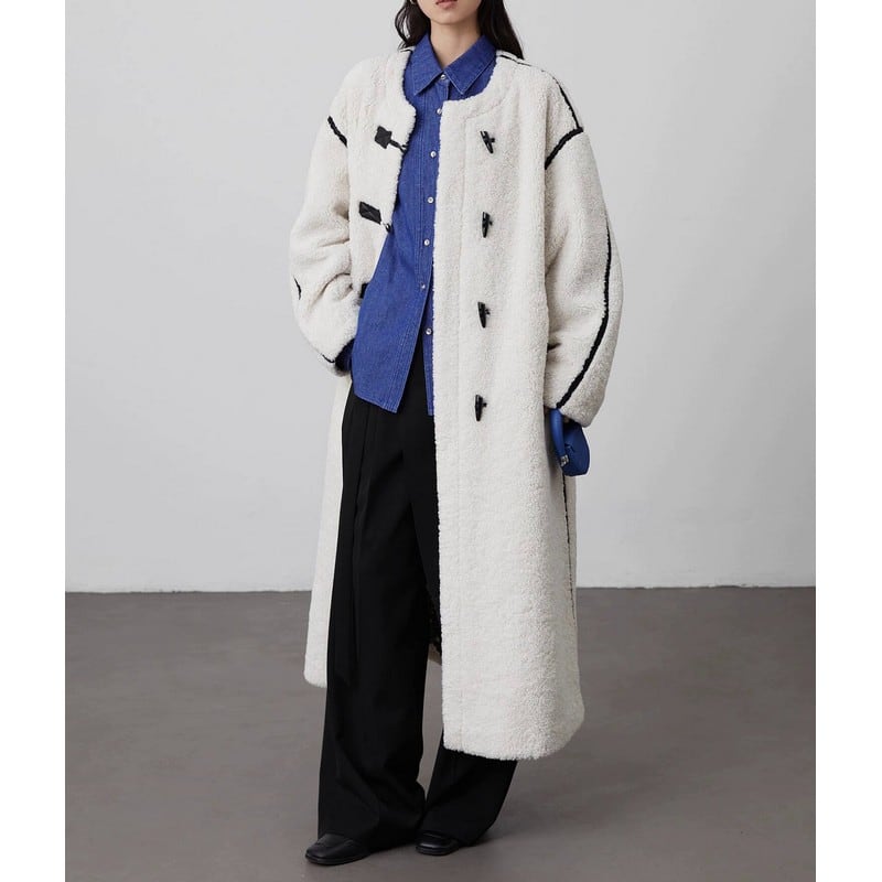 ふっくらとしたボア素材を贅沢に使用したロングコート。