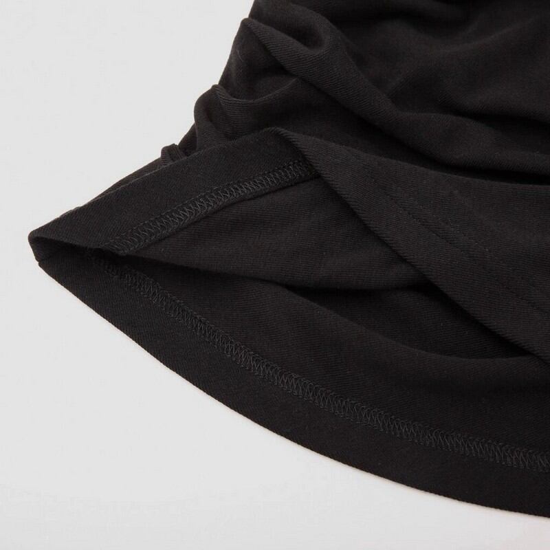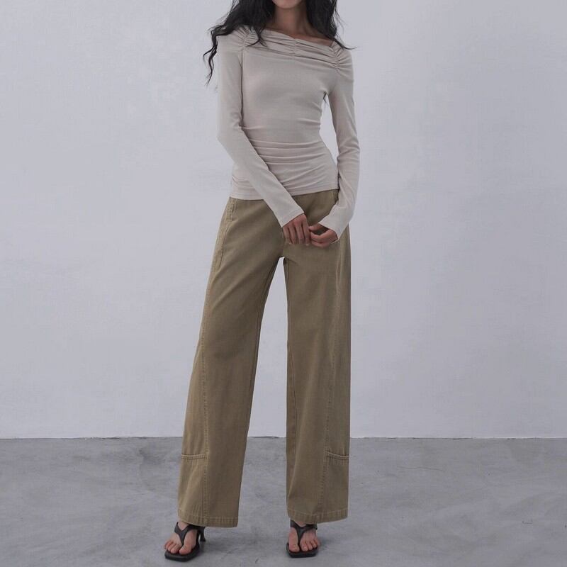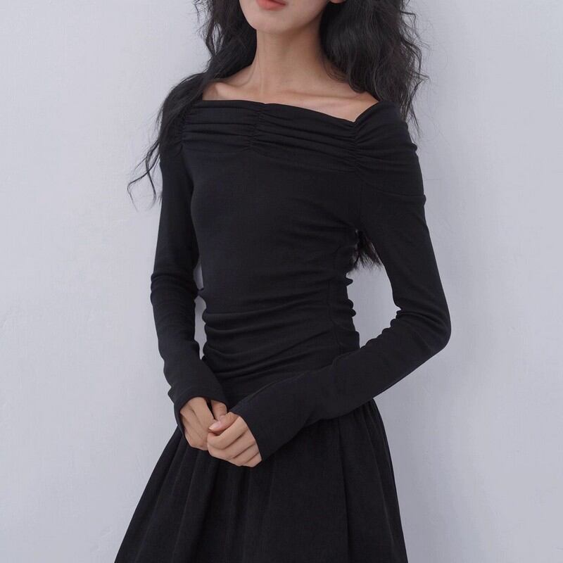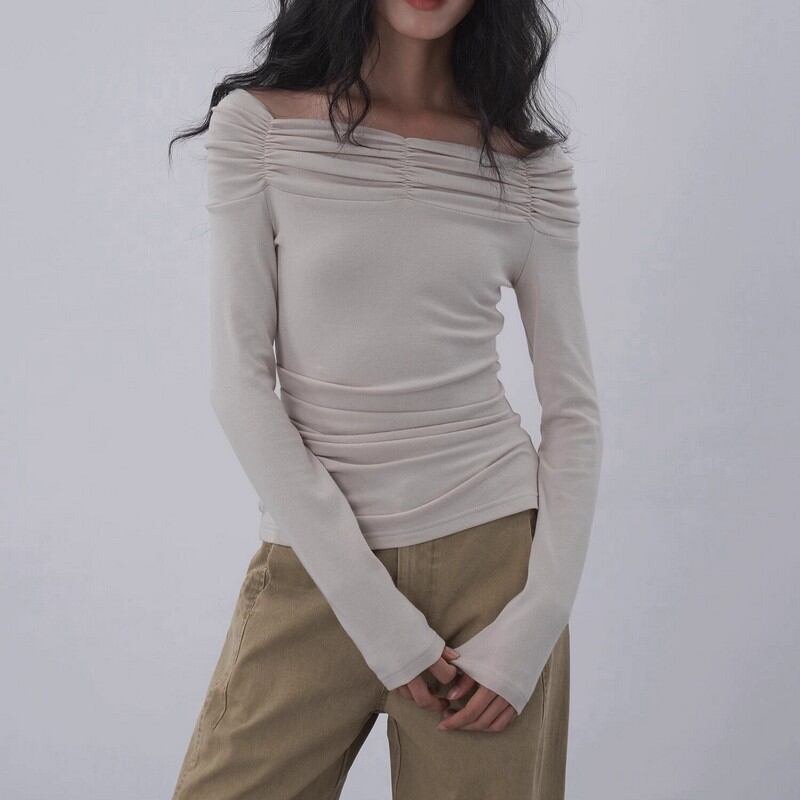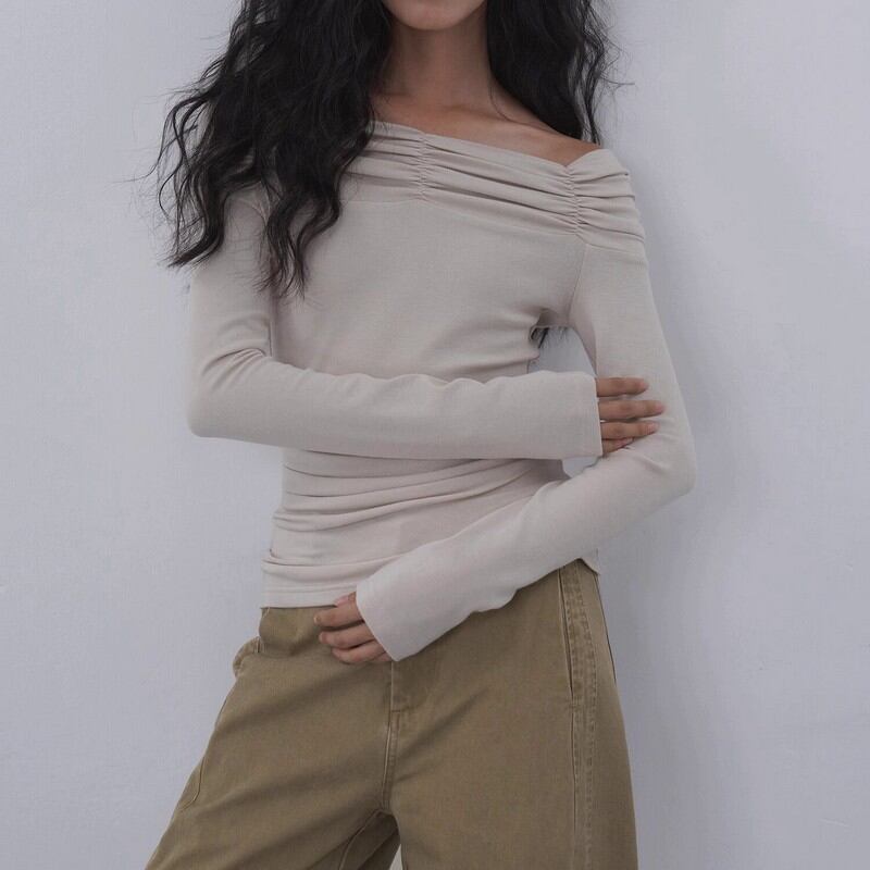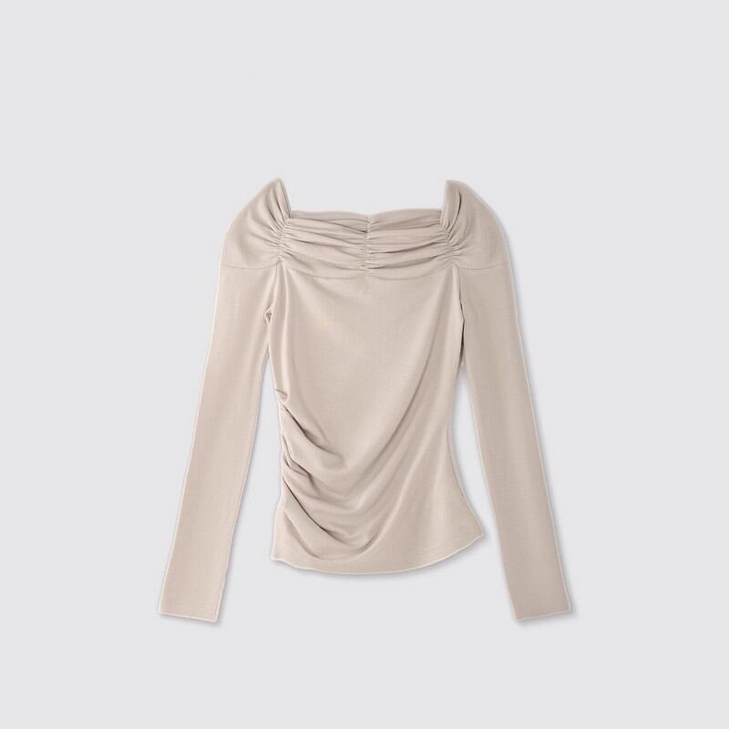 デコルテを優雅に見せる、幅広のシャーリングネックが魅力。
