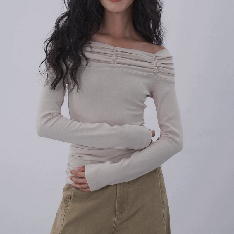 肩を落としてオフショルダーに、上げて広めのボートネックにと、