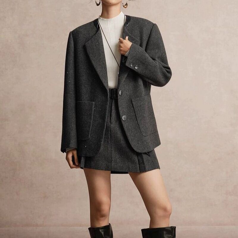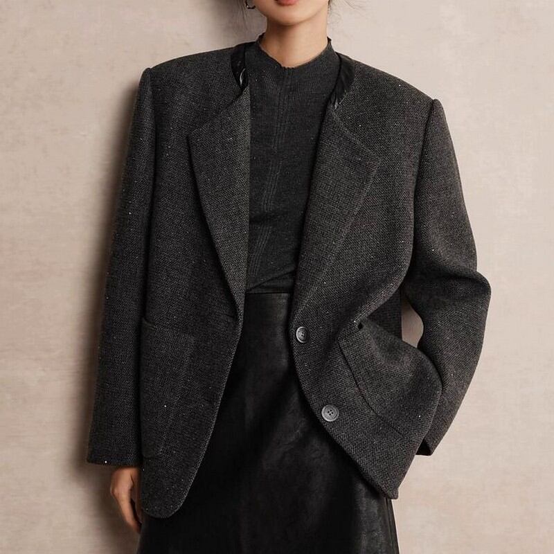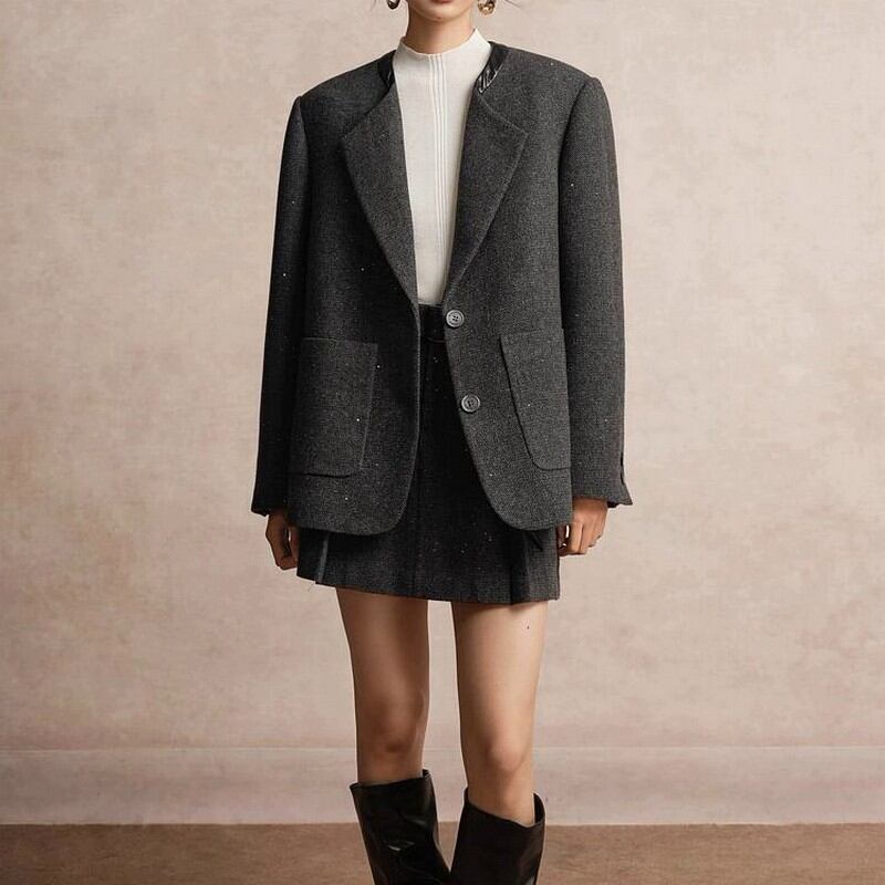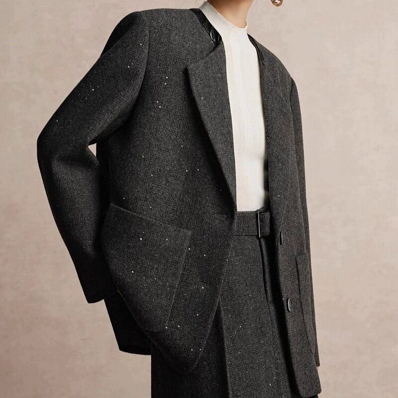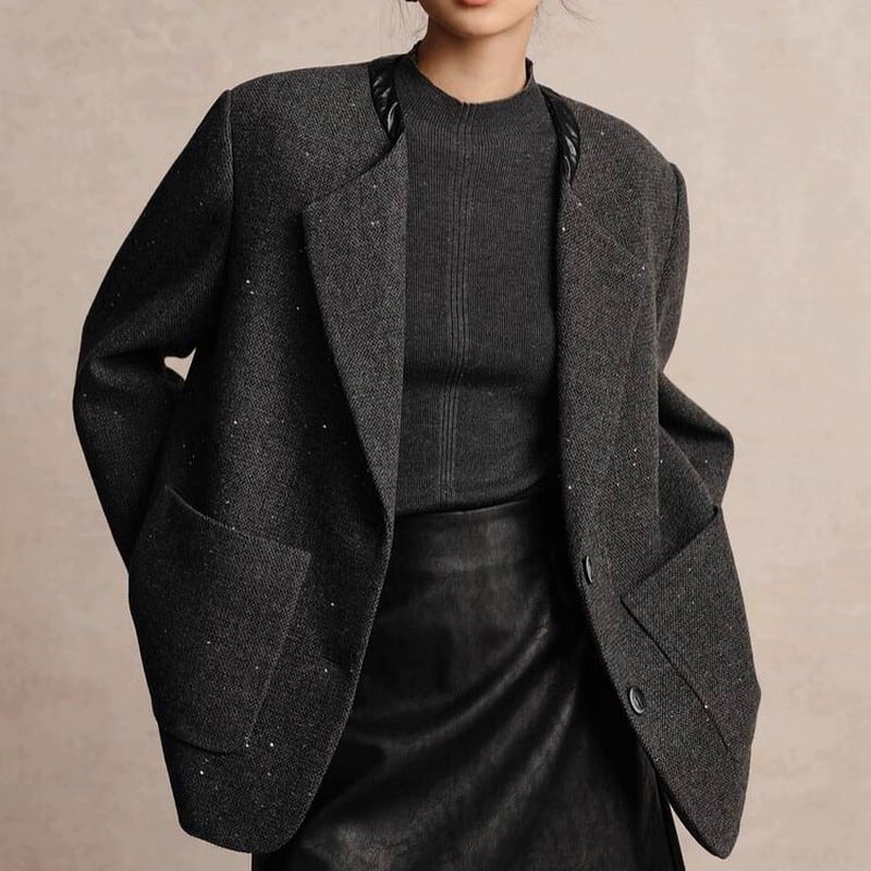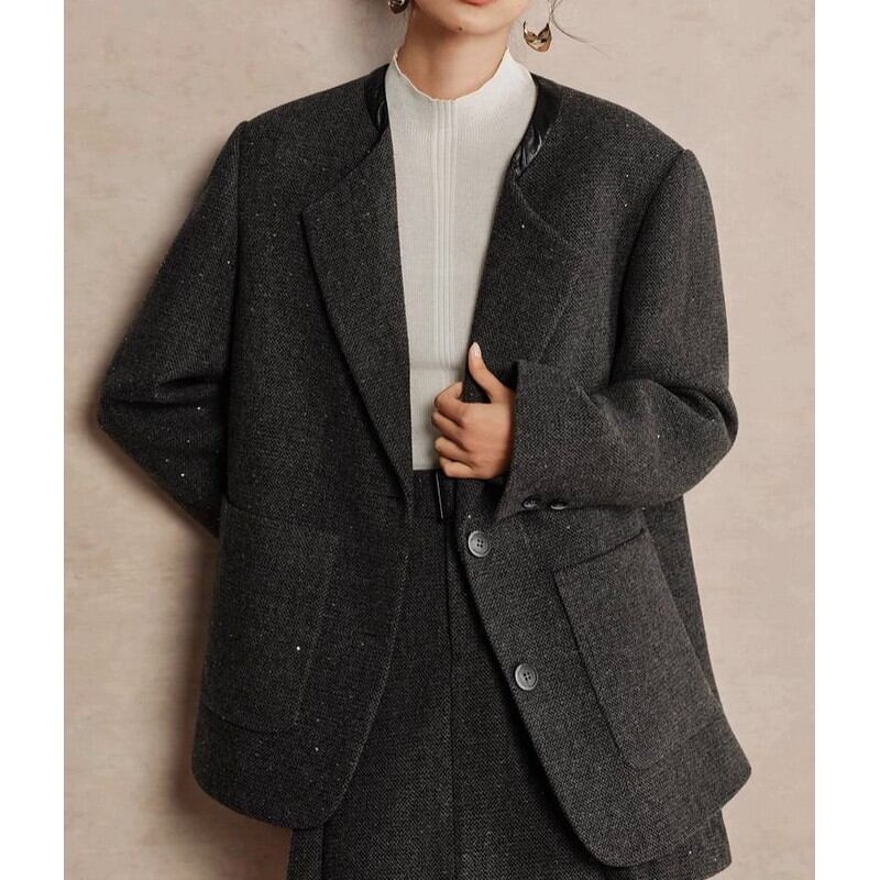 襟元のデザインや生地のラメ感がポイントの一枚。