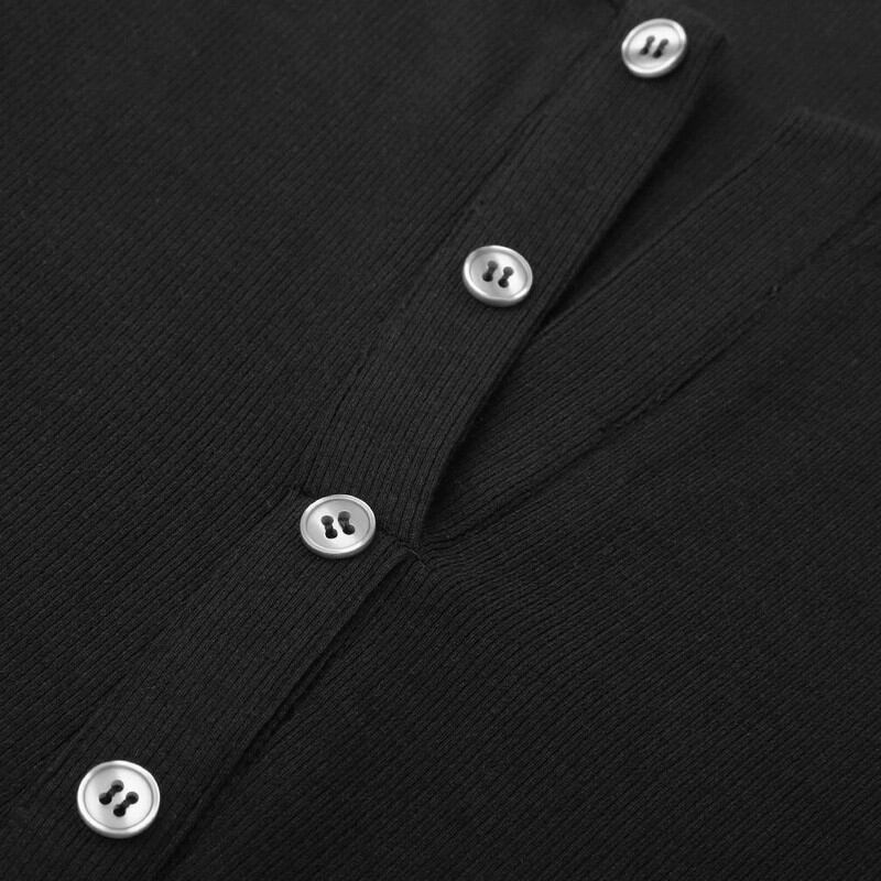 Vネックと、斜めに配されたボタン列が特徴的なリブトップス。
