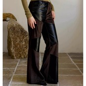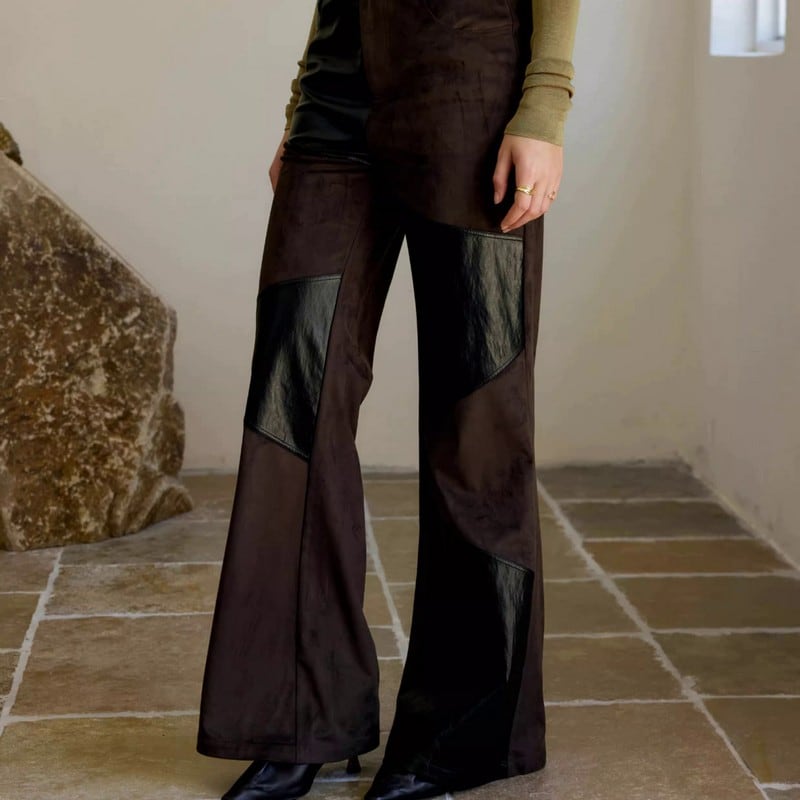 大胆なパッチワークデザインが目を引くフレアパンツ。