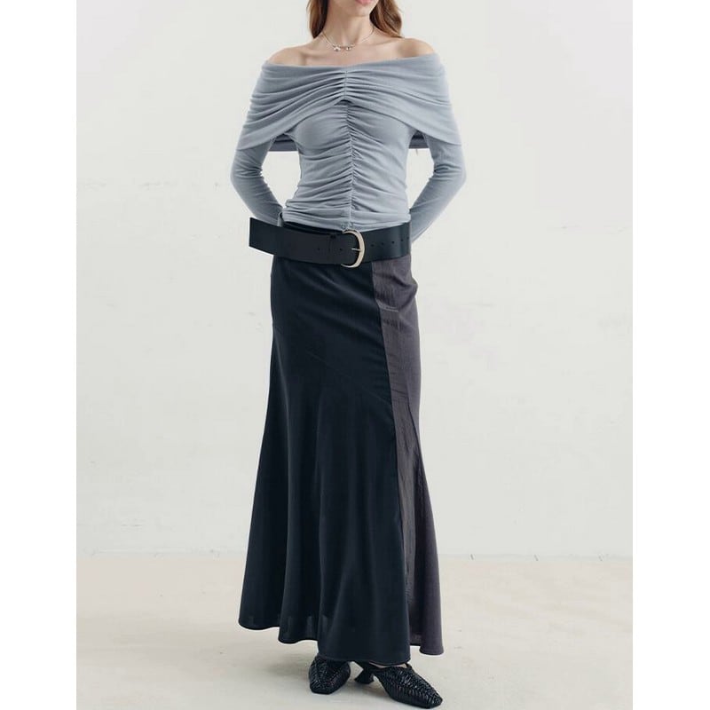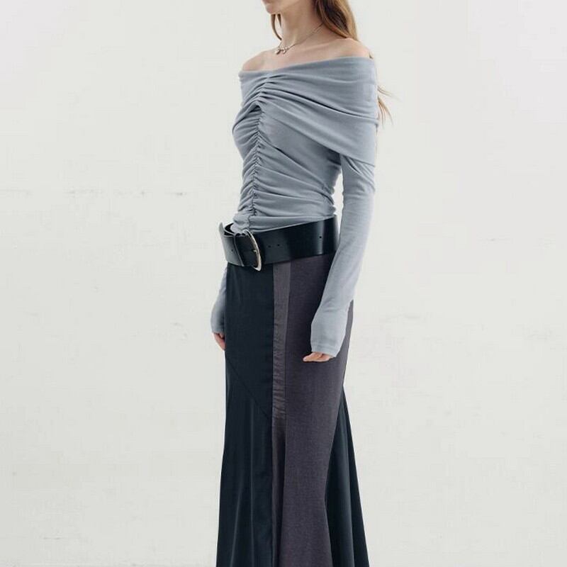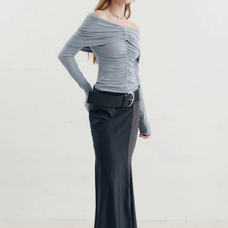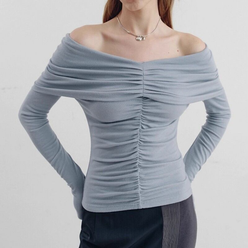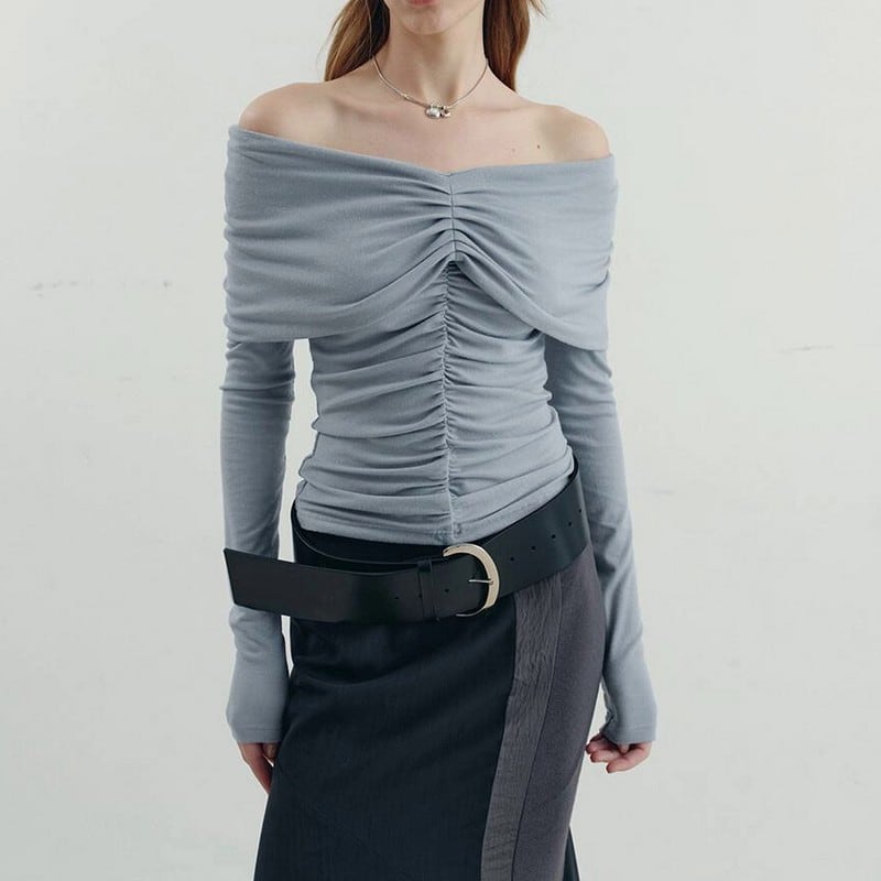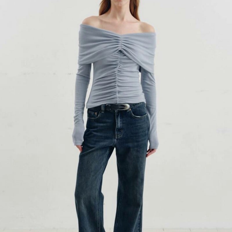 大胆なオフショルにギャザーデザインディティールで