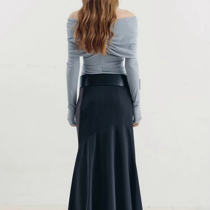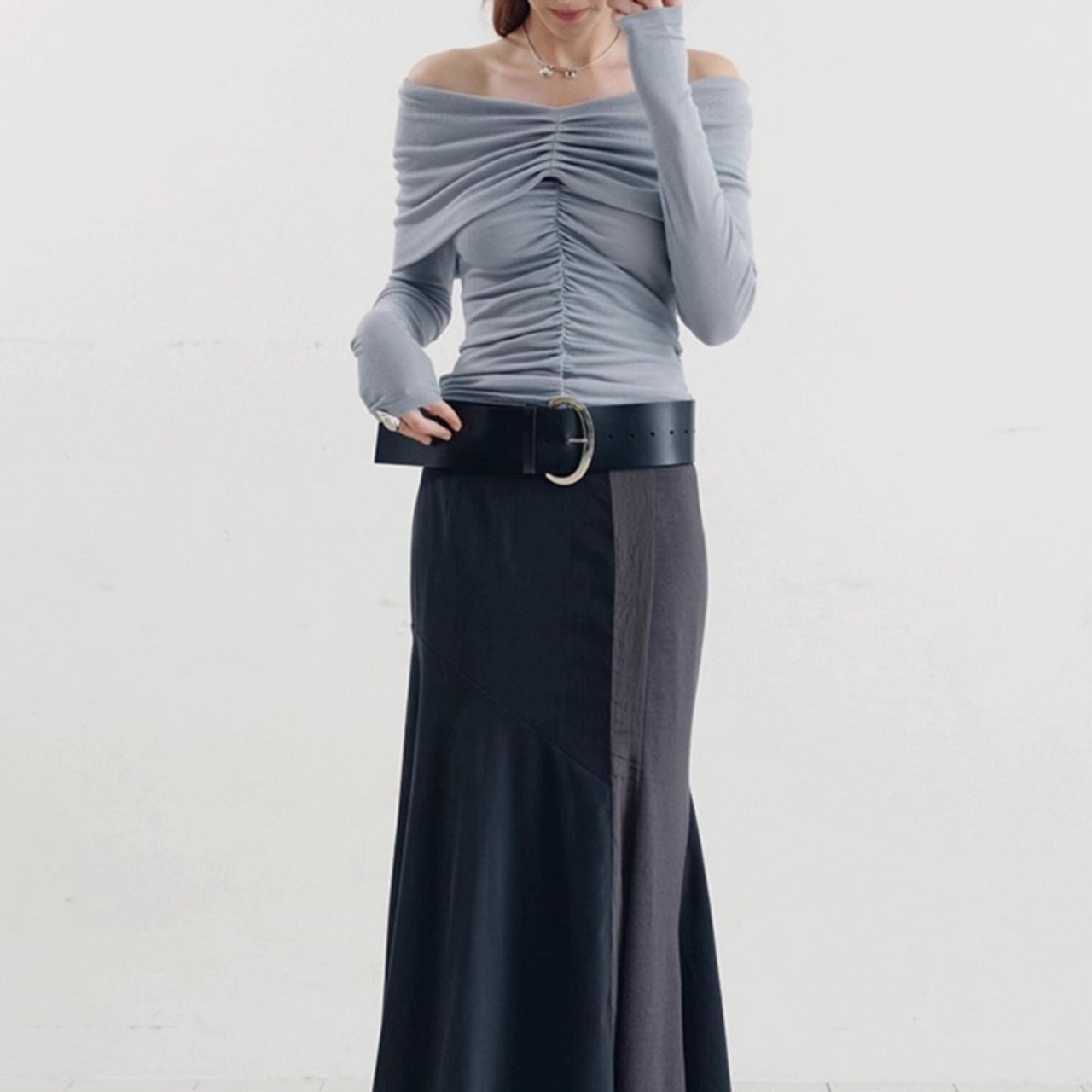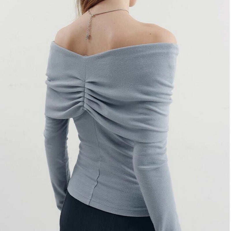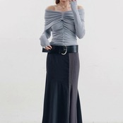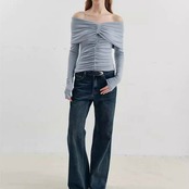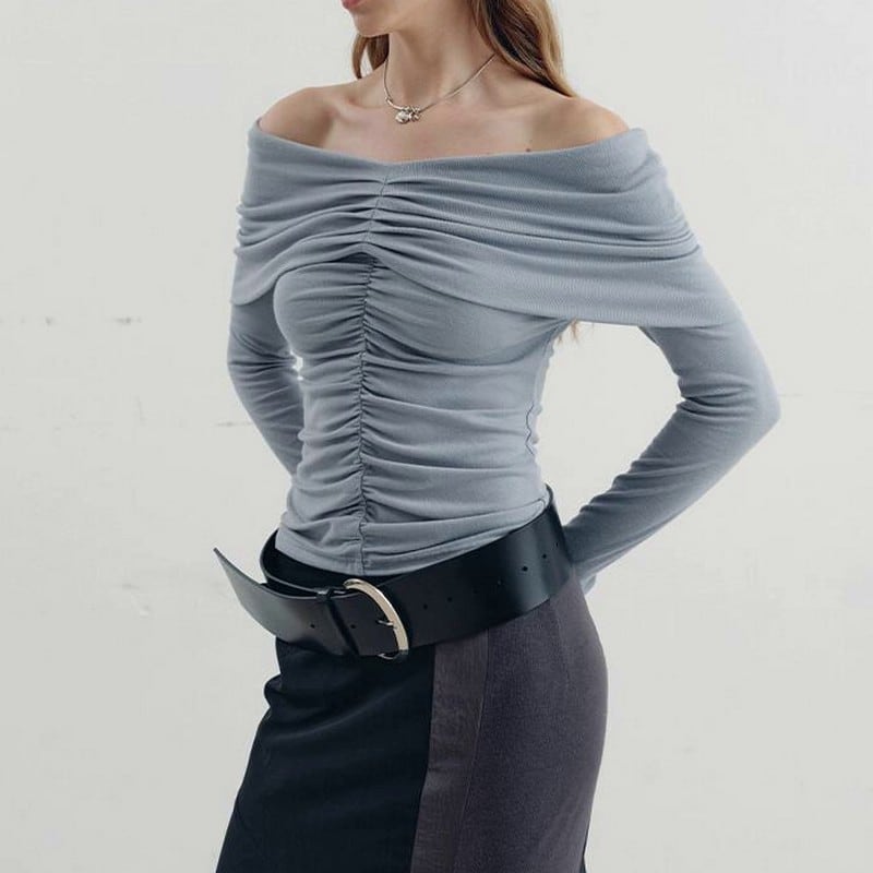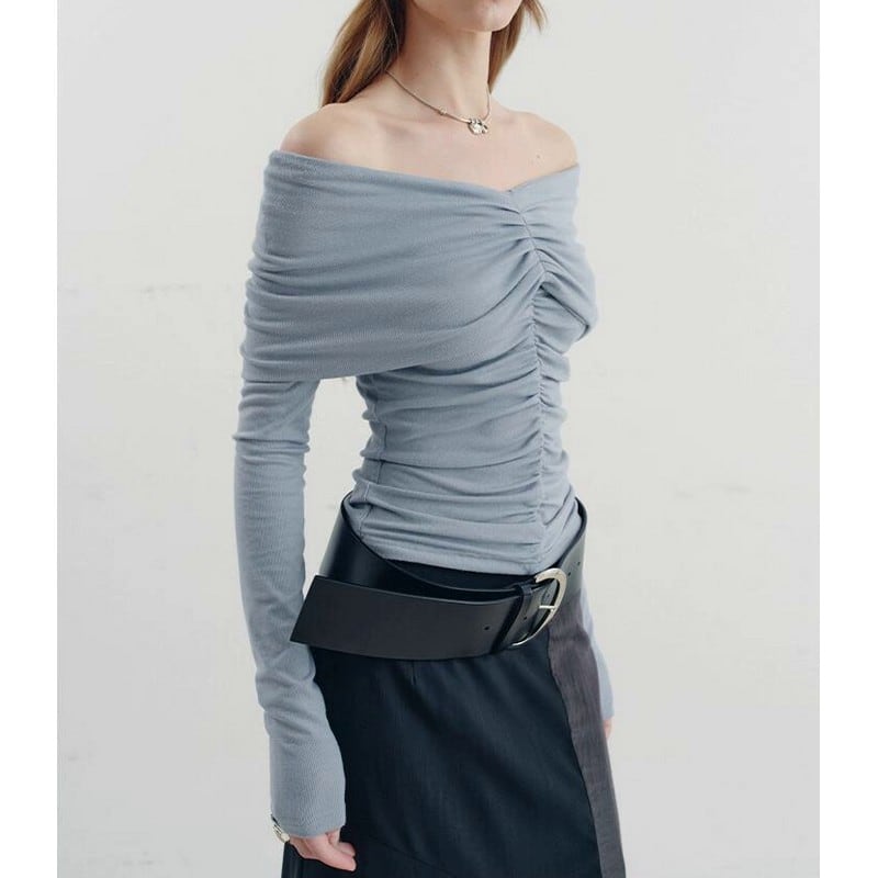 大胆なオフショルにギャザーデザインディティールで
