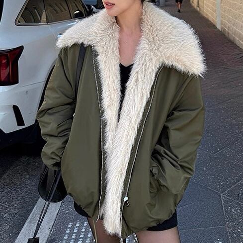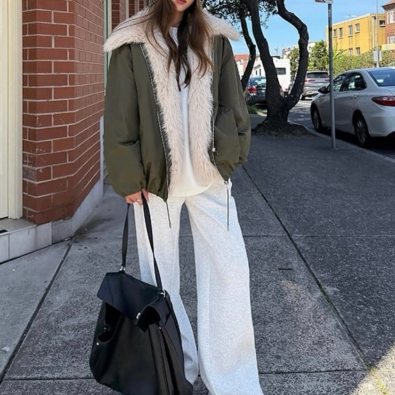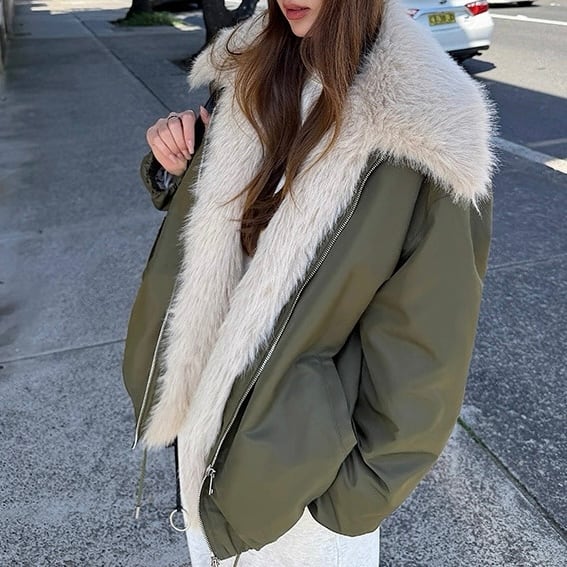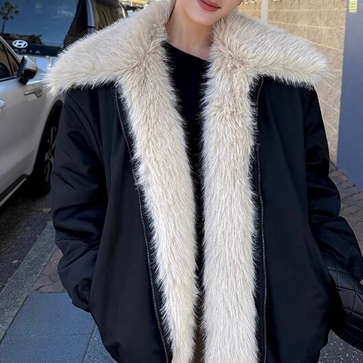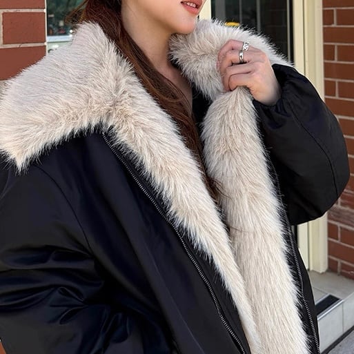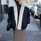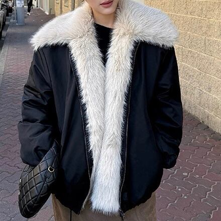 ボリュームのあるフェイクファーが顔まわりを華やかに見せる一着です。